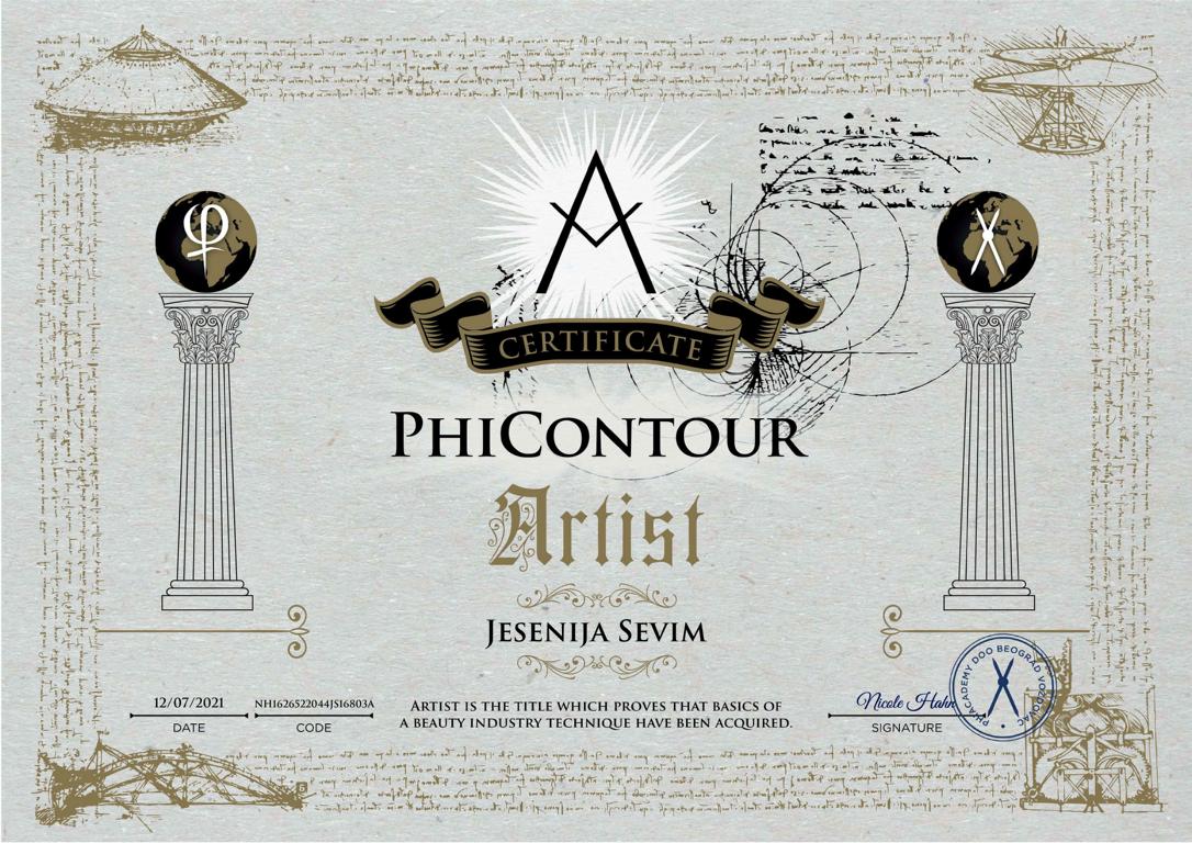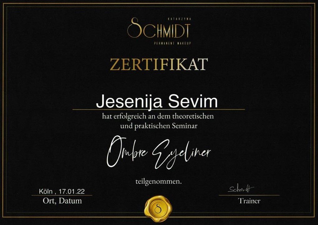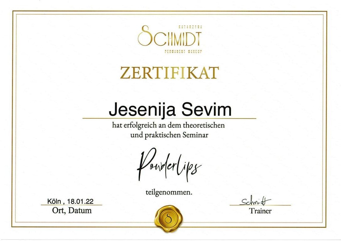 Ich habe meine Ausbildung zum PhiContour Artist bei der renommierten Phi Akademie by Branko Babic erfolgreich abgeschlossen und bin zertifizierte PMU-Spezialistin für Wimpernkranzverdichtung, dekorativen Eyeliner sowie Lippenpigmentierung. Solche Behandlungen erfordern ein Höchstmaß an Perfektion, Präzision und Hygiene.